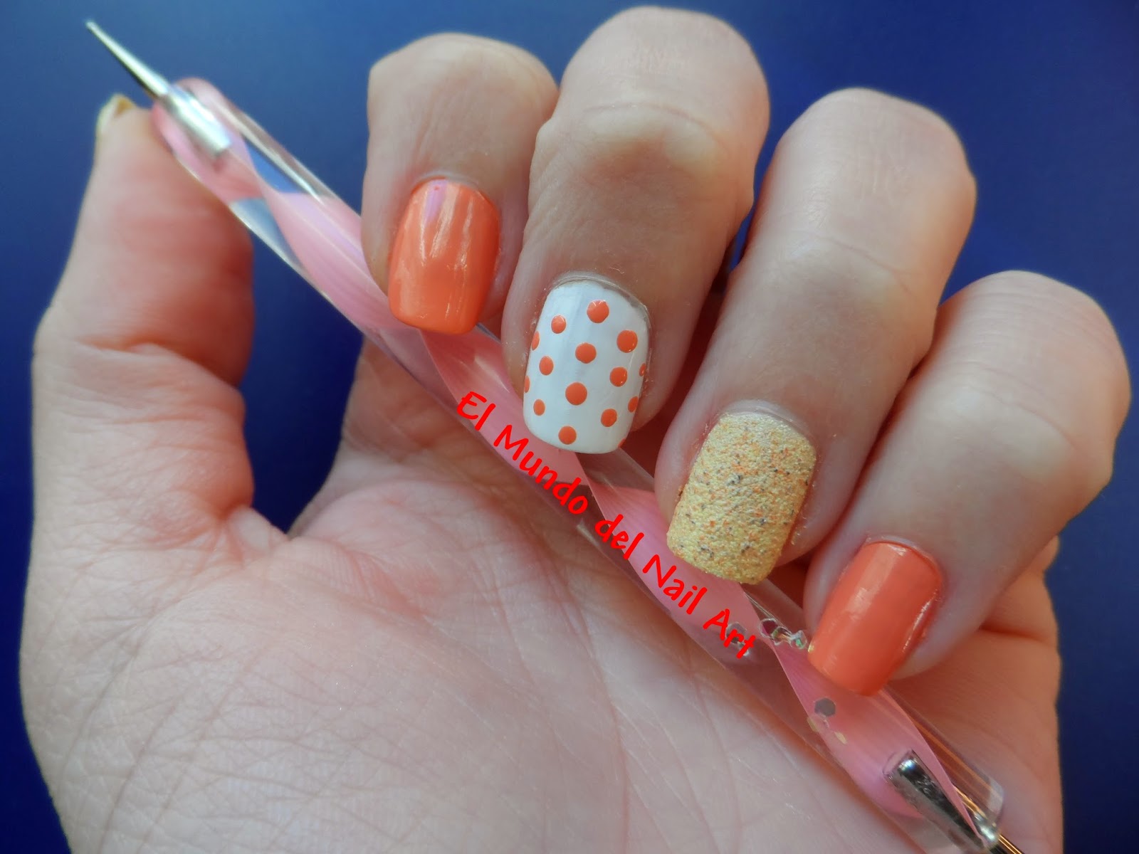 Luego, con ayuda de un Dotting Tool o puntero y con el mismo esmalte naranjita de antes, el nº25 de Elisabeth Llorca, me hice varios puntos en el dedo medio (primero hice los 4 puntos centrales y luego los laterales).